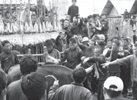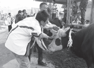 The core ritual of the festival is the sacrifi ce of mithuns. It takes place in front of the altar made at the back side of the house. Hundreds of men, women and children from the village and neighboring villages assemble in front of the altar to witness the sacrifice of mithuns. These are brought one after another from the lapang to the altar and tied at the specific bamboo stick(s) in front of the altar. A man, specifi cally assigned to sacrifi ce the mithun, fi rst purifi es his axe with rice powder and rice beer, and then cuts exactly at the neck of the mithun at the fi rst sway. After the slaughter, groups of men jump upon the mithun and put yatang (rice powder) in the mouth of the mithun in order to prevent the sound of the animal because it is believed as a bad omen if the sacrifi ced animal makes any kind noise while dying. This ritual is called Subu Panii. The sacrifi ced mithuns are immediately taken away to a nearby place and the meat is systematically cut up into pieces and stored for distribution.