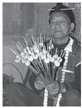 Rice plays an important role in the celebration of Muruñ. Rice powder (yatang) is offered to the mithun (that is to be sacrifi ced) and then distributed to all clan members. Therefore, a large quantity of rice powder is required to perform these rituals. Few days before the main rituals, the women of the family and clan voluntarily come forward and help in the preparation of rice powder – they pound it in the large wooden mortars and store it in baskets. On the day of the sacrifice, this rice powder is distributed to the clan members. A day before the sacrifice of animals, the shaman prepares ginger which is to be offered to the supernatural spirits through the sacrificed mithuns. This preparation is carried out by the shaman and his assistants and it begins late in the evening in the house of the host of Muruñ. The shaman sits in a corner of the house which is meant for keeping all the sacred objects and performs chanting as he cuts the ginger into small pieces; these are then placed in rows on a bamboo stick. Each stick contains four pieces of ginger and the number of sticks is equivalent to the number of mithuns to be sacrificed. This preparation is known as tajer. Ginger is considered pure and hence offered to the mithuns in order to purify them.
