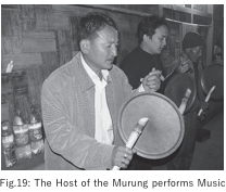 After sacrifi cing the animals, men and women from the host’s clan form different groups and visit the house of the host and perform a ceremonial dance called Hirii khannii. This dance is performed in order to praise and bless the family. During this dance, they sing a song which generally praises the Muruñ performer. The host family members also join the dance and they perform music by beating the talo (Tibetan brass plate). For all the dancers, the host serves rice, meat and rice beer. Several groups visit the house and perform dance and it continues the whole night.