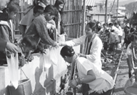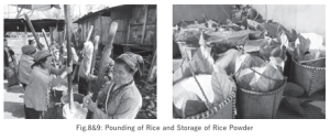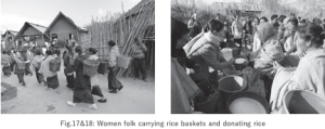 Donation of rice to the family who performs Muruñ is an important component of the ritual. This is referred to as Pukung Ambing. Women from every household of the entire valley bring rice in a basket and donate to the Muruñ performer. This event begins early in the morning (of the fi nal day) and continues the whole day. The host family engages a team of young men and women to carefully record the amount of donations. The closest relatives donate rice in a larger basket (yakhang), those who are further off in relation donate rice in a mid-size basket (paroeg), and those who are furthest donate rice in a small basket (poyeg). Sometimes, money is also offered in lieu of rice. In return, the host family offers a piece of dried meat in the basket along with tapyo (traditional black salt) and serves them good food and drink on that day. The donated rice is stored in the granary of the host family.
