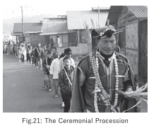 Penii refers to a long ceremonial procession performed by the clan of the Muruñ performer. Men, women and children belonging to the particular clan arrive at the host’s house early in the morning (of the fi nal day of Muruñ) for procession. All of them wear the traditional attires and ornaments and the men carry traditional sword with them. The elderly men and the shaman lead the procession and the procession goes in a systematic way. It starts from the host’s house and goes to all the villages in the valley and returns to the house in the evening. During the procession, they enter other villages, and people from those villages welcome them and offer different kinds of refreshment, rice beer etc. In some villages they sacrifi ce mithun and host them with a grand feast, depending on the relationship or friendship between the host and others.