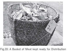 Distribution of the sacrifi ced meat is an important act of the Muruñ celebration and it is a custom that the meat should be given to each and every Apatani household in the valley. The ceremony of meat distribution is called Dulu. The meat of the sacrifi ced mithuns and cows are cut into small pieces, counted and kept in baskets for distribution to all Apatani households in the valley. The distribution begins early in the morning and completes by evening. A team of men are engaged to do this distribution and in return they get some portion of meat. The head of the sacrifi ced mithun is very significant. The biggest head of the mithun is given to piinya who is the closest friend of the Muruñ performer from any of the Apatani clans. All the remaining heads is given to the eldest clan members and later they return the horns to the Muruñ performer.