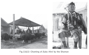 Subu Hinii (subu = mithun, hinii = chanting) is an integral part of the overall ritual. Mithun plays a vital role in the rituals of Muruñ celebration. The core ritual of Muruñ is the sacrifi ce of mithuns to the supernatural spirits. The number of mithuns to be sacrificed depends upon the economic status of the person who hosts the Muruñ. All the mithuns to be sacrificed are brought to the la'pañ (community platform) and the shaman chants over the mithuns throughout the night; and this chanting is known as Subu Hinii. During this chanting the shaman holds the ginger sticks in hand and addresses the mithuns thus: “We are going to sacrifice you to appease the spirits and not for us”. He further directs the animals where they should go after sacrifice. The shaman supposedly possesses the knowledge of which part/organ (of the mithun) is meant for which spirit, and therefore he directs these organs through ritual chanting.