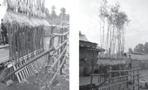 The altar known as subu siikha plays a significant role in Muruñ. The shaman selects an appropriate place outside the host’s house to erect the altar and gives all necessary instructions to a group of men for its preparation. The altar is made up of bamboo; bamboo shaves occupy the central portion, while small decorative bamboo ornaments are used to decorate the altar. It usually takes more than a day to construct the altar. At the front (of the altar), thick bamboo pegs are erected to which later mithuns will be tied and sacrificed. All the core rituals like chanting, offerings and sacrificing of mithuns, dogs, eggs, hens etc. are performed by the shaman at this altar. The sacrificed blood is applied on the altar and the sacrificed hens and eggs are hung up on the altar. All these rituals at the altar are conducted by men. Once the event is over, the altar continues to remain till it gets destroyed naturally.